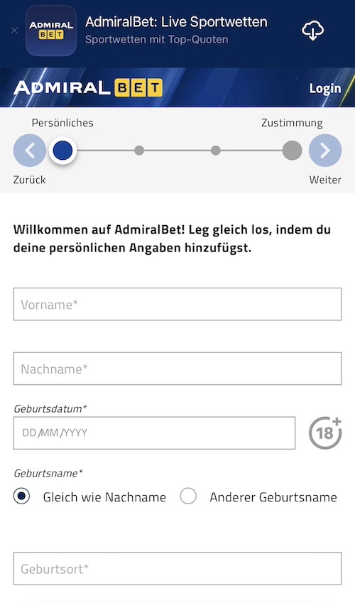 Beim AdmiralBet anmelden musst du im ersten Schritt die personenbezogenen Daten eingeben.