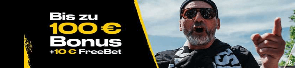 Bei der Ersteinzahlung wird Neukunden ein Bonus gewährt. Du erhältst dabei eine Gutschrift von 100 % oder bis zu 100 € als FreeBet, die Mindesteinzahlung liegt bei 10€.