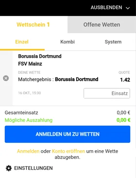 - Durch einen Klick auf den Wettschein öffnet sich eine Gesamtübersicht. Nun gilt es den Wetteinsatz festzulegen sowie die Wette abschließend zu platzieren.