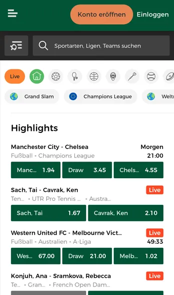 - Gewünschte Sportart in der Navigation mit passendem Wettbewerb auswählen.