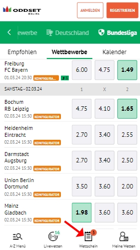 Mobil Wetten zu platzieren ist in der Desktop-Ansicht wie auch der ODDSET App simpel strukturiert und ganz einfach zu erledigen: