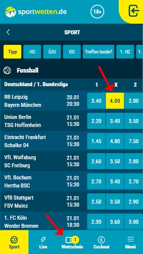 - Einloggen oder Sportwetten.de Registrierung tätigen.