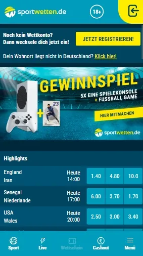 Alle potenziellen Neukunden informiert Sportwetten.de auf der mobilen Webseite über die Registrierung (Banner ganz oben) . Der Sportwetten.de Login befindet sich wiederum in der Ecke rechts oben mit dem Pfeil-Icon.