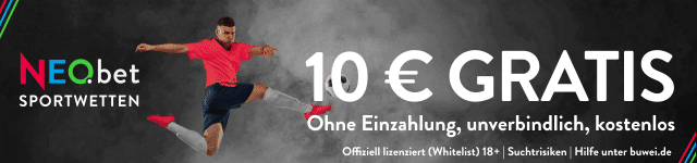 Für Highroller und routinierte Tipper hat NEO.bet den Profi-Bonus parat. Dieser Wettbonus verspricht eine Bonussumme von 100€. Hier wird die Einzahlung aber „nur“ verdoppelt. NEO.bet gilt zwar als neuer Wettanbieter, hat aber als einer der ersten Buchmacher in Deutschland eine Lizenz vom Regierungspräsidium Darmstadt bekommen.