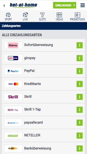 Bet-at-home hat hier seine Hausaufgaben gemacht und kann mit seiner Auswahl an Zahlungspartnern voll punkten. Damit ist der Bookie an den Besten wie Bet365 oder bwin nah dran.