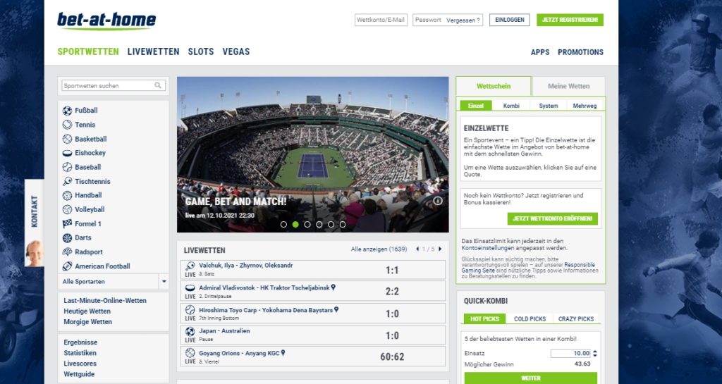 An das riesige Live Wettangebot der besten Livewetten Anbieter wie Bet365 oder bwin reicht das Angebot jedoch nicht ganz heran. Wer also die volle Ladung möchte, sollte bei diesen Bookies ein Konto eröffnen. Sonst hat Bet-at-home auch viel zu bieten und das bezieht sich nicht nur auf das Wichtigste.