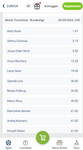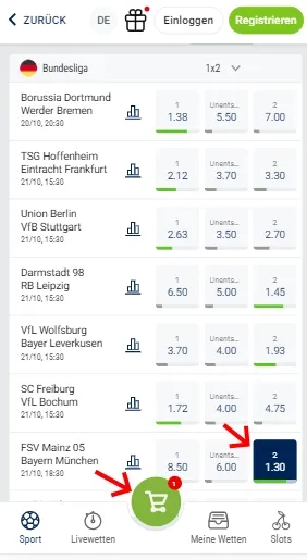 Wähle deine passenden Quoten aus. Diese werden via Desktop automatisch in deinem Wettschein angezeigt. Bei Verwendung eines Mobilgeräts muss der Wettschein manuell ausgeklappt werden. Ein entsprechendes Einkaufswagen-Icon ist sichtbar.