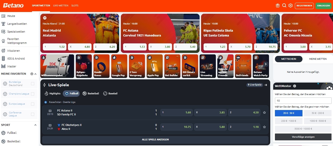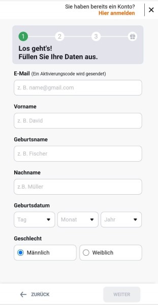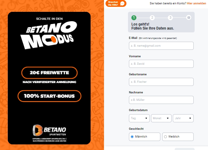 - Schritt: Erstes Wettkonto bei Betano über einen Wettbasis-Link eröffnen. Im Zuge der Registrierung den Bonuscode „BETMAX“ eingeben.