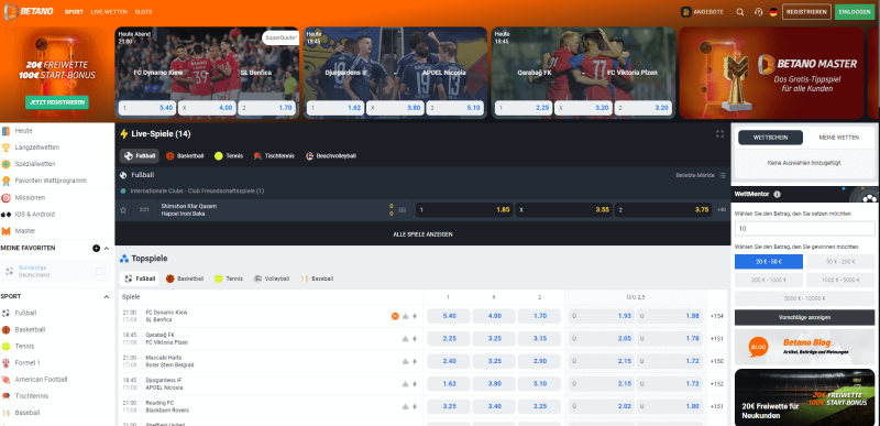 Die Website von Betano kann durchaus als schlicht und übersichtlich betitelt werden. Grundlegend gibt es wie bei vielen anderen online Wettanbietern eine drei Spalten Unterteilung. Anhand der linken Spalte lässt sich zwischen den Sportarten bzw. Wettbewerben differenzieren.