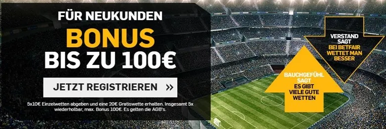 Neue Spieler müssen fünf Wetten mit jeweils mindestens 10 Euro Wetteinsatz abschließen, um eine Gratiswette im Wert von 20 Euro zu erhalten. Um alle fünf Gratiswetten gutgeschrieben zu bekommen, muss man das fünfmal wiederholen.