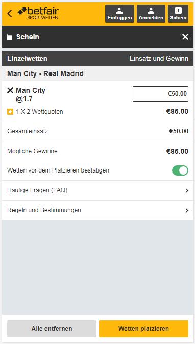 Wettschein öffnen, Wetteinsatz eingeben & Wette bestätigen