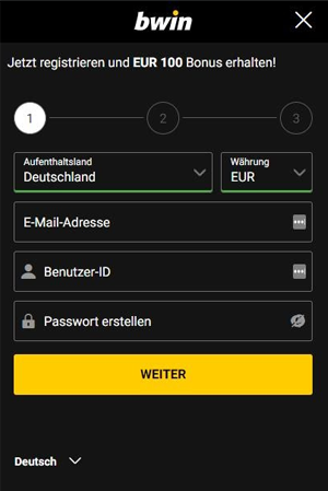 Auf der Homepage bzw. der App (wenn du den Bwin App Download bereits abgeschlossen hast) musst du oben rechts auf den Button “Registrieren” klicken. Daraufhin öffnet sich unmittelbar das Registrierungsformular.