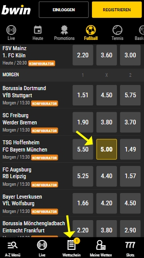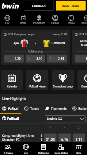 Als erstes musst du Dich anmelden. Entscheide Dich dann, für welche Sportart, Liga und Partie du eine Wette abgeben möchtest. Wähle dazu auf der Bwin Homepage entsprechend zwischen den Sportarten und Ligen aus.