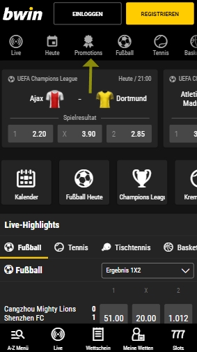 Bwin bietet jederzeit interessante Aktionen an. Am besten informiert ihr euch über den Menüpunkt „Promotions“ auf der bwin Startseite.
