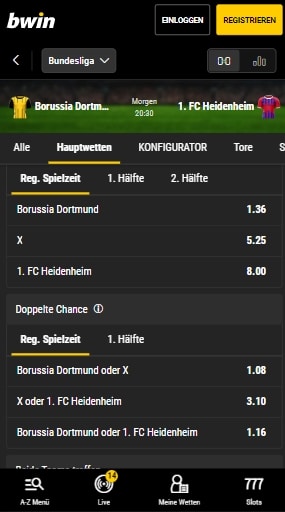 Der mobilen Nutzung der bwin-Seite kommt auch zugute, dass hier nicht so viel angezeigt werden kann. Das lässt die Webpage übersichtlicher und weniger überladen erscheinen. Dass beim Scrollen Header- und Footer-Bereich sichtbar bleiben, ist auch äußerst hilfreich.