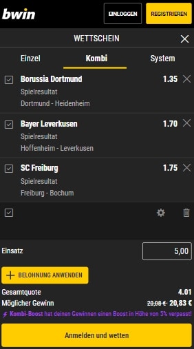 Ein Wettschein-Update erfolgte zuletzt im März 2025 und machte den Bwin Wettschein multifunktionaler. Es lassen sich mehrere Wetten gleichzeitig tippen und Konfiguratoren hinzufügen. Wer aktive Freebets hat, sieht sie im Wettschein und kann sie einlösen.