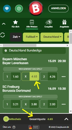 Was den Wettschein angeht, muss dieser auch auf dem Desktop manuell geöffnet werden. Er taucht bei Auswahl einer Quote rechts unten auf. Auch daran merkt man, dass Crazybuzzer die Desktop-Seite nur stiefmütterlich behandelt.