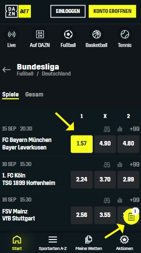 DAZN Bet Wettschein auf einem Mobilgerät öffnen