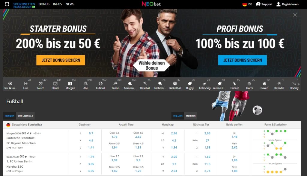 Hier hat NEO.bet einigen Bookies etwas voraus und steht mit den erfahrenen Bookies wie Bet365, bwin, Betway oder Sportingbet auf einer Stufe.