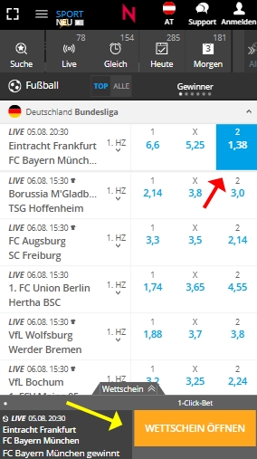 Die Auswahl könnte z. B. beim Duell zwischen Bayern und Dortmund lauten, dass Bayern siegreich ist und beide Teams mindestens ein Tor erzielen.