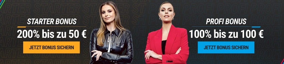 Bonus: 100 % bis zu 100 € oder 200 % bis zu 50€