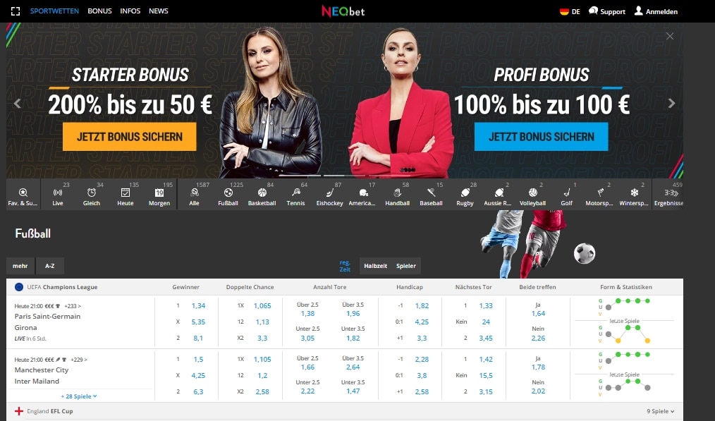 Gut macht NEO.bet seine Sache in den beliebtesten Ländern wie England, Deutschland, Spanien und Italien. In der Premier League, Bundesliga, La Liga und Serie A sind mehr als 100 Wettmärkte pro Partie online und es sind auch pro Land mehrere Wettbewerbe online.