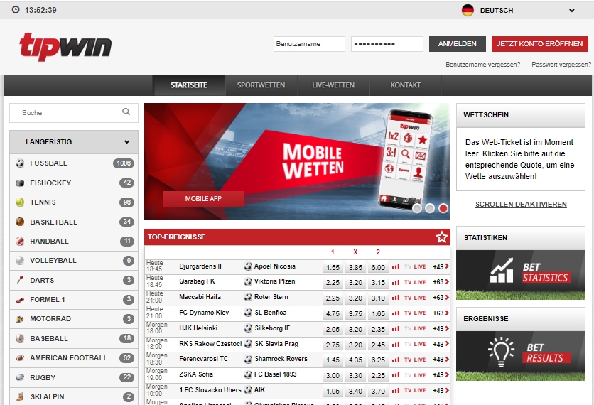 Die Tipwin Live Wetten haben die wichtigsten Wettbewerbe und Wettmärkte, aber auch viele weniger beliebte Events zu bieten. Tipwin kommt zwar in Sachen Umfang nicht an die Top-Bookies heran, jedoch ist hier das Feld aufgrund der Bestimmungen im Rahmen des Glücksspielstaatsvertrags mehr zusammengerückt.