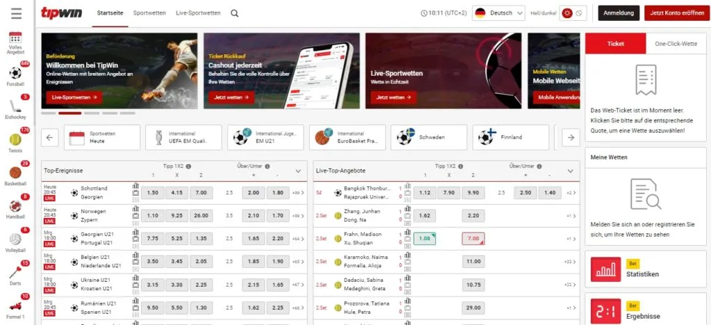 An vorderster Front befindet sich Fußball, gefolgt von Tennis, Basketball und Eishockey. Auch einige Randsportarten hat Tipwin zu bieten.