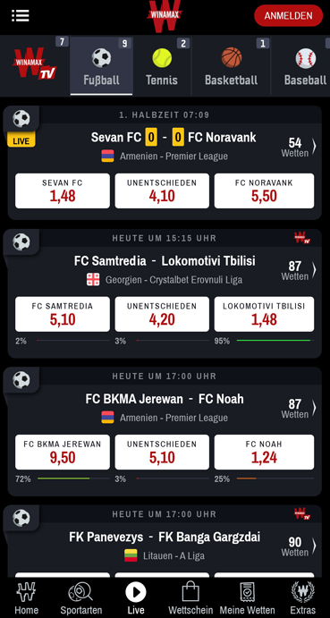 Sobald die gewünschte Sportart mit dem dazugehörigen Wettbewerb ausgewählt wurde, offenbaren sich im mittleren Segment alle verfügbaren Events.