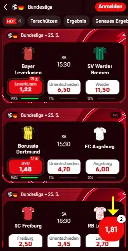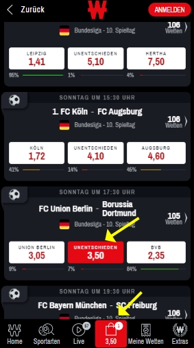 - Quote aussuchen und Wettschein im Footer öffnen.